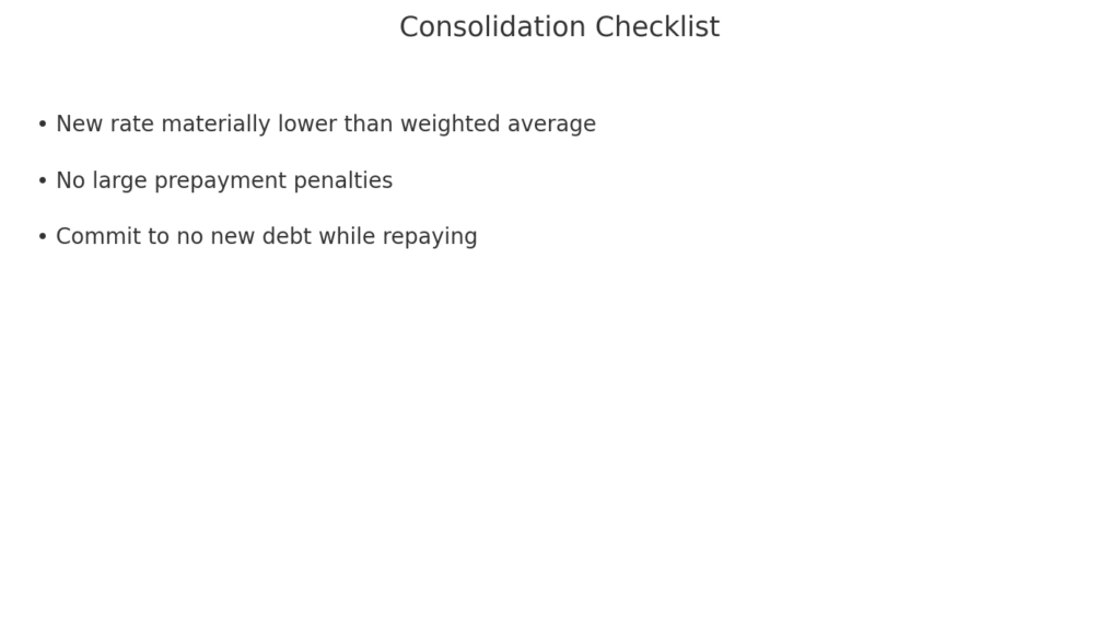Combining multiple high‑cost debts into one lower‑rate loan can simplify payments and reduce cost. But without spending discipline, balances can rebuild and negate benefits.