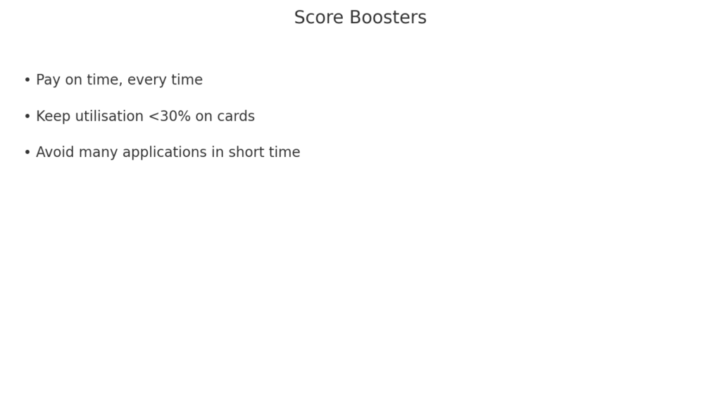 Set auto-pay for EMIs/bills, reduce credit card balances, and review your credit report periodically to fix errors.