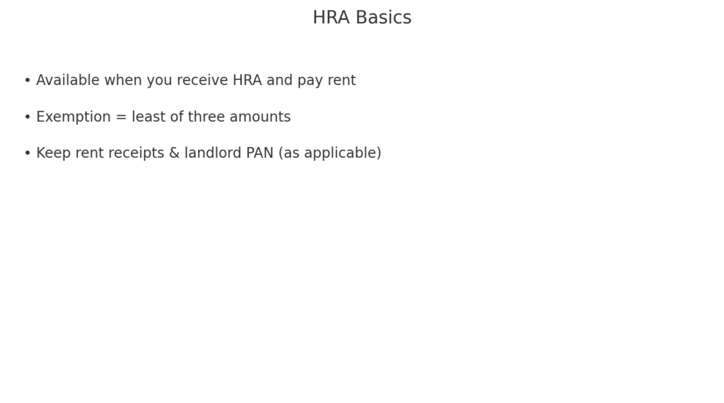 House Rent Allowance (HRA) can reduce taxable salary if you pay rent. Calculate exemption as the least of: actual HRA received, excess of rent over 10% of basic pay, and 50% (metro)/40% (non‑metro) of basic.