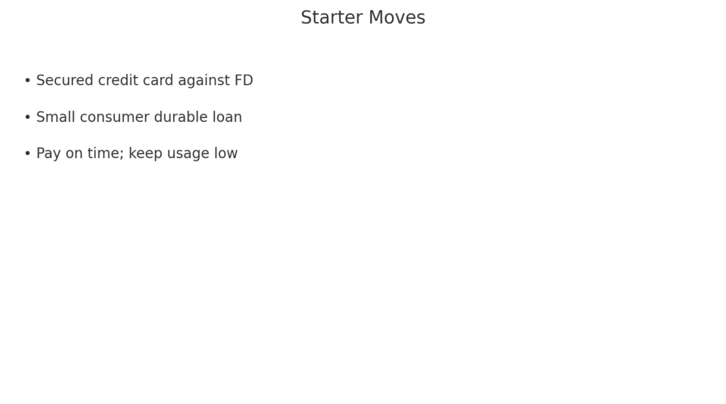 With no past loans, bureaus can’t rate your risk. Start with low‑risk products like secured cards or small ticket loans and build history.