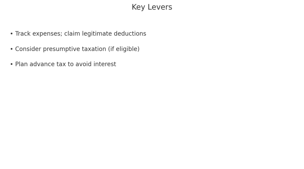 Self‑employed individuals can optimise tax by maintaining proper books, claiming eligible business expenses, and choosing presumptive schemes where applicable.